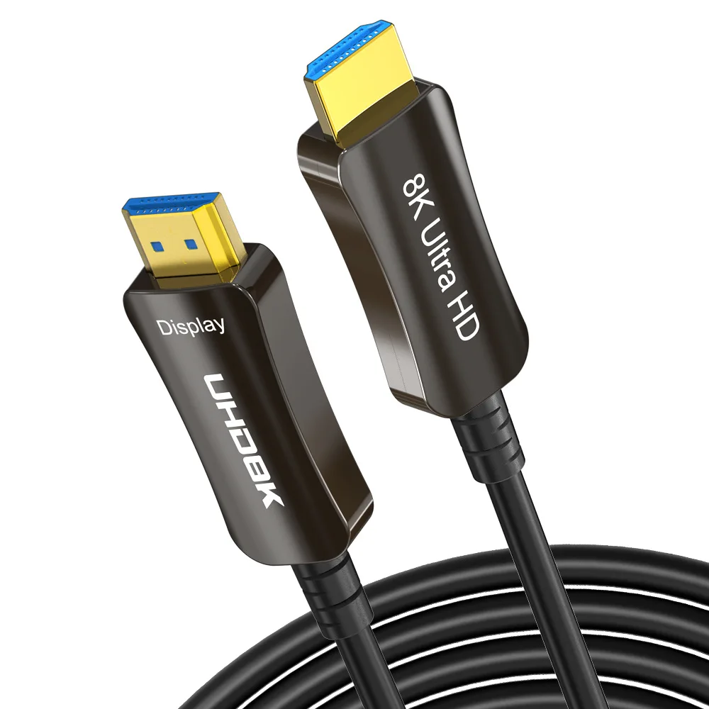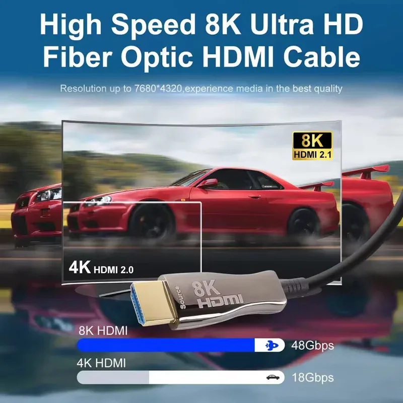 An HDMI 2.1 optical fiber cable supporting 8K at 60Hz, 4K at higher refresh rates, matching the user's requirements.