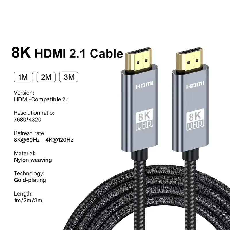 An HDMI 2.1 cable supporting 8K and 4K at high refresh rates, compatible with GPUs and PCs.