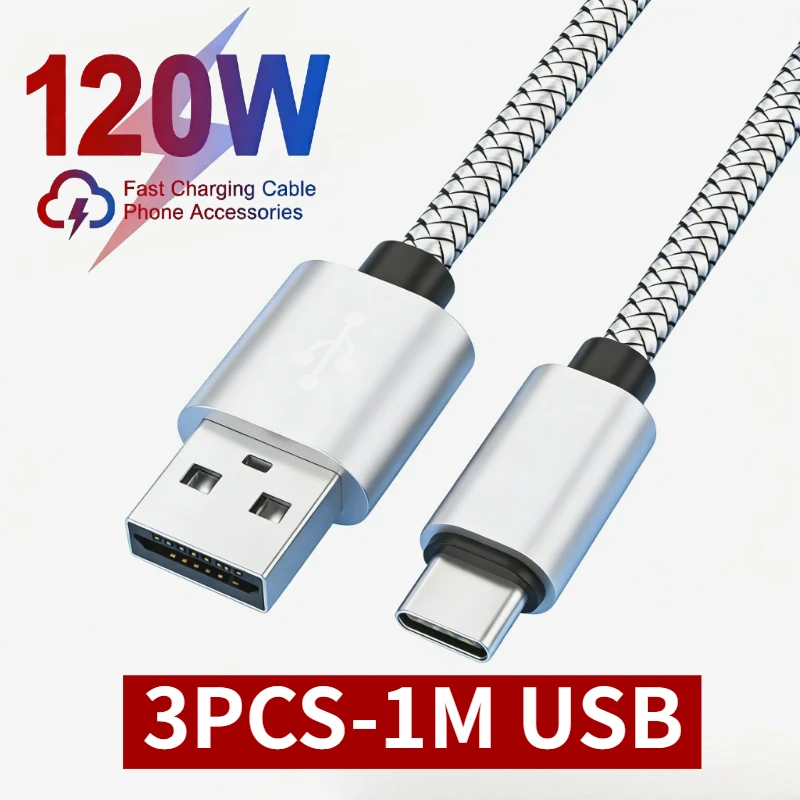 3PCS USB A To Type C Charging Cable 2A Fast Charger Nylon Data Cable 1M for Iphone Android Huawei Samsung TypeC Charging Device